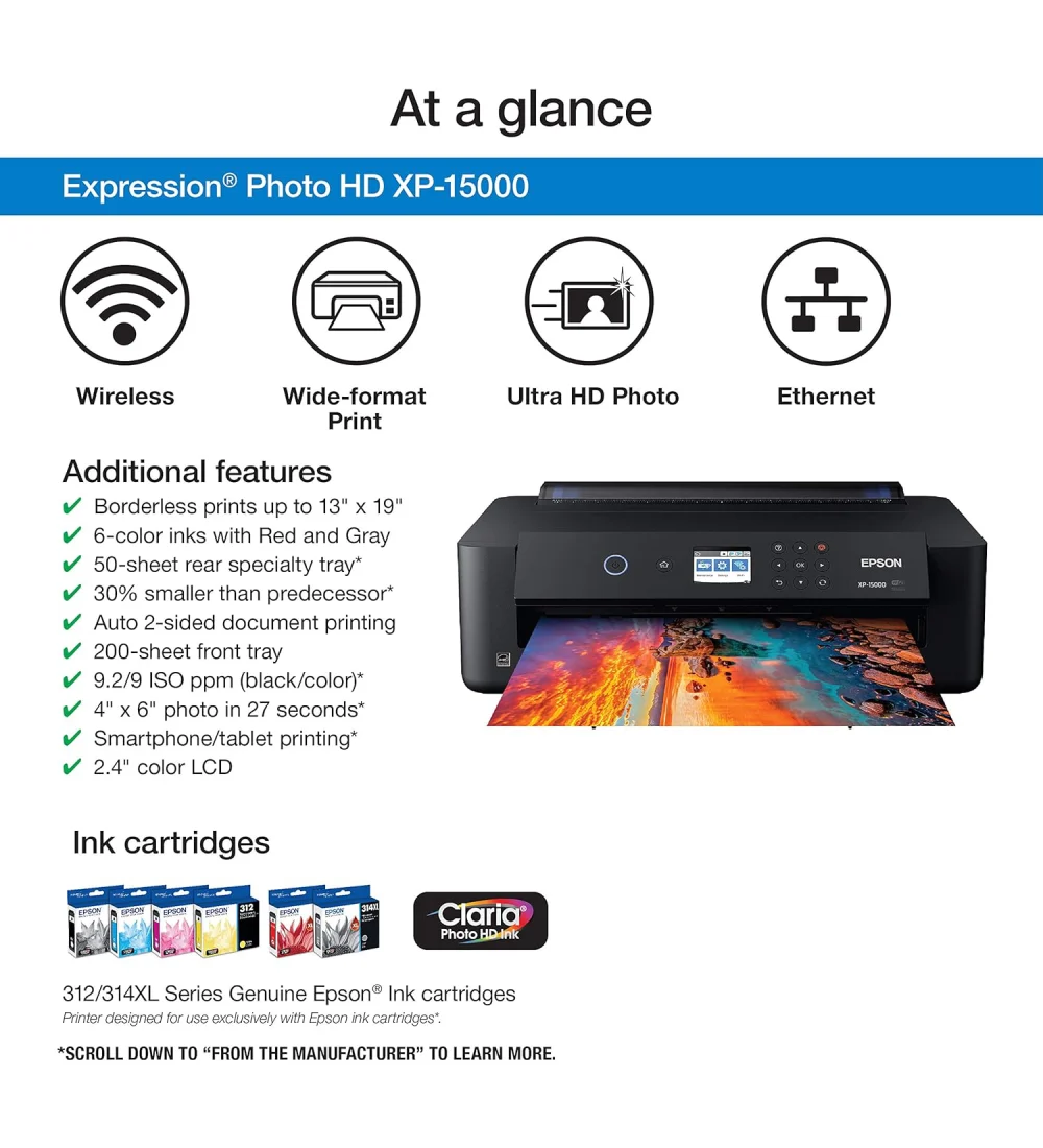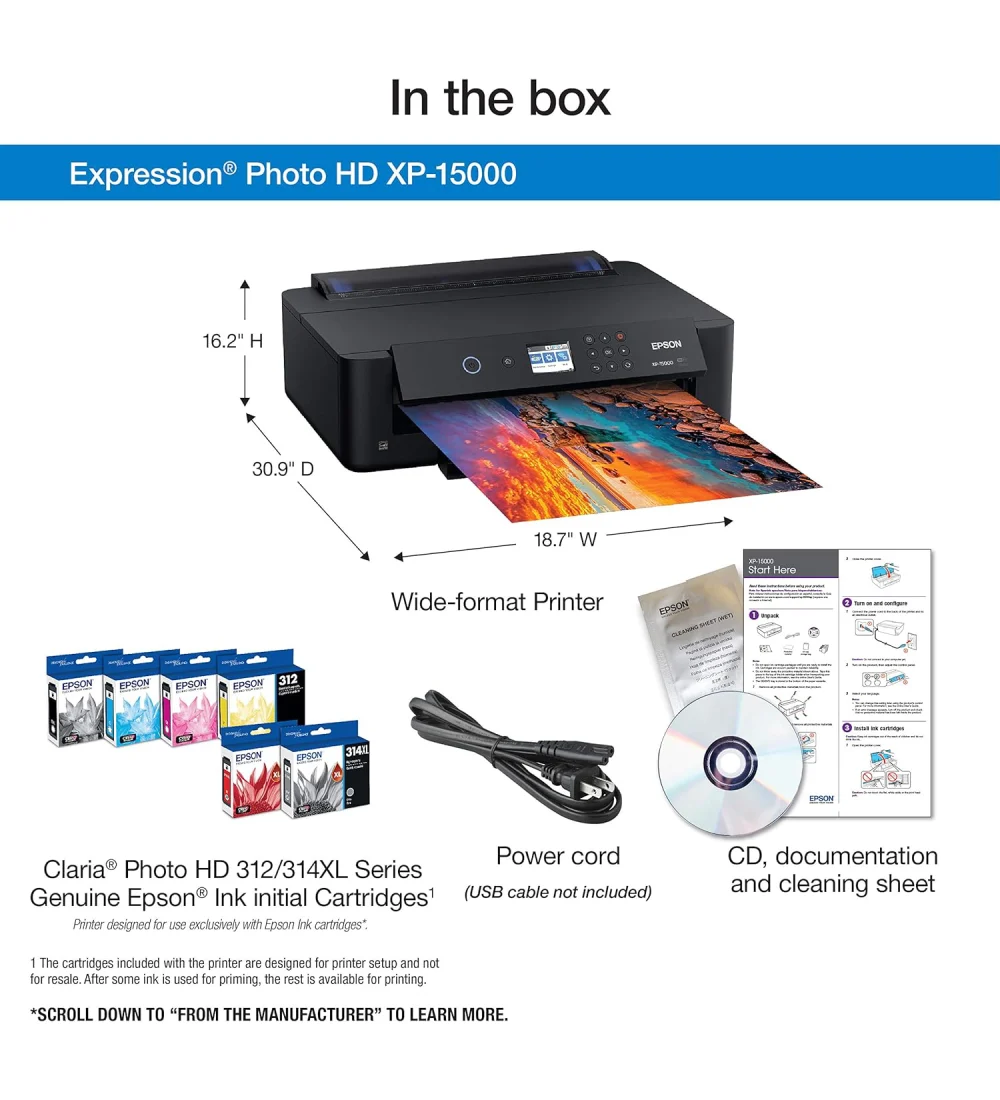 - What’s in the box : Expression Photo HD XP-15000 printer, CD-ROM for product setup, Power cord, 4x Claria Photo HD 312-I ink cartridges (1x Black, 1x Cyan, 1x Magenta, 1x Yellow), 2x Claria Photo HD 314-I ink cartridges (1x Gray, 1x Red), 1 Cleaning Sheet.
